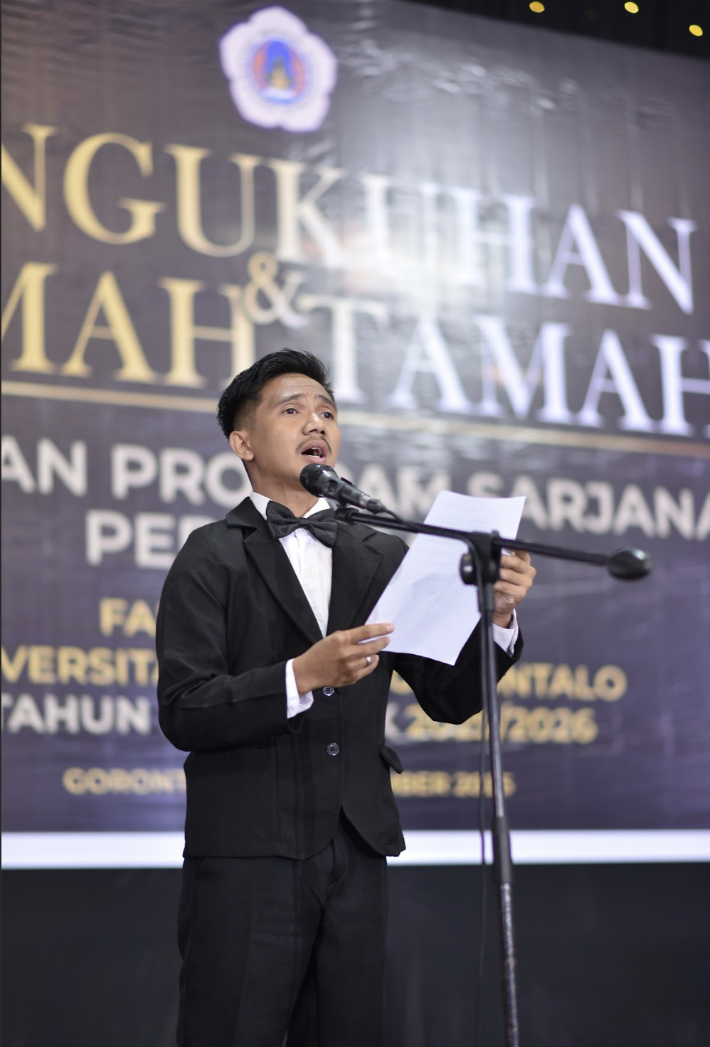 Dekan Fakultas Teknik UNG secara resmi mengukuhkan 57 Calon Wisudawan/wisudawati dalam acara Pengukuhan & Ramah Tamah Lulusan Sarjana Fakultas Teknik pada hari Kamis, 24 Nopember 2025 mulai jam 09.00 di Grand Sumber Ria Ballroom Kota Gorontalo. Rencananya Wisuda UNG periode ke-58 akan diselenggarakan pada hari Rabu, 26 Nopember 2025. Wakil Rektor Bidang Akademik Prof. Dr. Abdul Hafidz Olii, SPi., M. Si. dan sejumlah Dekan dari berbagai Fakultas di UNG turut hadir dalam kegiatan tersebut. Dalam kesempatan ini, Prof. Hafidz menyampaikan ucapan selamat kepada calon wisudawan/wisudawati dan terlebih kepada orangtua. "Di balik kesuksesan kalian menyelesaikan studi, ada orang tua yang selama ini berdo'a dan berjuang demi kesuksesan kalian", ucap Prof. Hafidz.