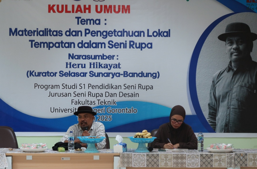 Gorontalo, 12 November 2025 — Program Studi Pendidikan Seni Rupa, Fakultas Teknik Universitas Negeri Gorontalo (PSR FT-UNG) menggelar Kuliah Umum bertema “Materialitas dan Pengetahuan Lokal Tempatan dalam Seni Rupa”. Kegiatan berlangsung di Ruang Galeri FT UNG dan dihadiri oleh sekitar 150 peserta, yang terdiri atas dosen, mahasiswa, pegiat seni rupa, serta peserta dari Manajemen Talenta Nasional (MTN). Hadir sebagai Narasumber utama adalah Heru Hikayat, kurator dari Selasar Sunaryo – Bandung.