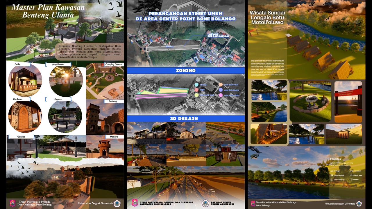 Mahasiswa Jurusan Teknik Arsitektur Universitas Negeri Gorontalo menghasilkan karya perancangan kawasan wisata melalui program magang di Dinas Pariwisata, Pemuda, dan Olahraga Kabupaten Bone Bolango. Kegiatan ini menjadi bagian dari implementasi pembelajaran berbasis praktik yang memberikan pengalaman langsung kepada mahasiswa dalam proses perencanaan dan perancangan kawasan pariwisata.