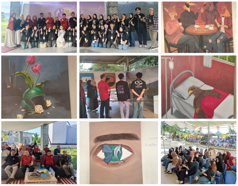 Pembukaan pameran dihadiri oleh Dekan Fakultas Teknik Prof. Dr. Ir. Sardi Salim, M.Pd., IPU., ASEAN Eng., Wakil Dekan Bidang Kemahasiswaan Dr. Moh. Yusuf Tuloli, ST., M.T., para dosen Jurusan Seni Rupa dan Desain, serta undangan dan pengunjung umum. Kehadiran pimpinan fakultas dan sivitas akademika menegaskan bahwa pameran ini diposisikan sebagai bagian strategis dari proses pendidikan, bukan sekadar kegiatan seremonial.