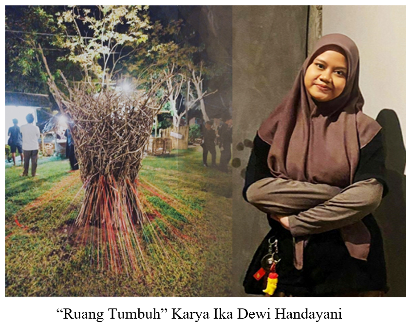 Berbeda dengan Vidya dan Nasir, Ika Dewi Handayani mengeksplorasi limbah ranting-ranting kayu yang dikombinasikan dengan benang warna-warni sebagai material. Melalui material tersebut Ika menghasilkan karya dengan tajuk “Ruang Tumbuh’, yang dipajang di ruang terbuka.