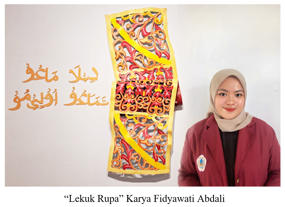 Sementara itu, Fidyawati Abdali, mengeksplorasi spons karet sebagai utama karya melalui pengolahan, pewarnaan, dan modifikasi hingga melahirkan struktur baru, yang diberi judul “Lekuk Rupa”. Karya tersebut menampilkan objek kaligrafi Arab dan ornamen secara berdampingan.